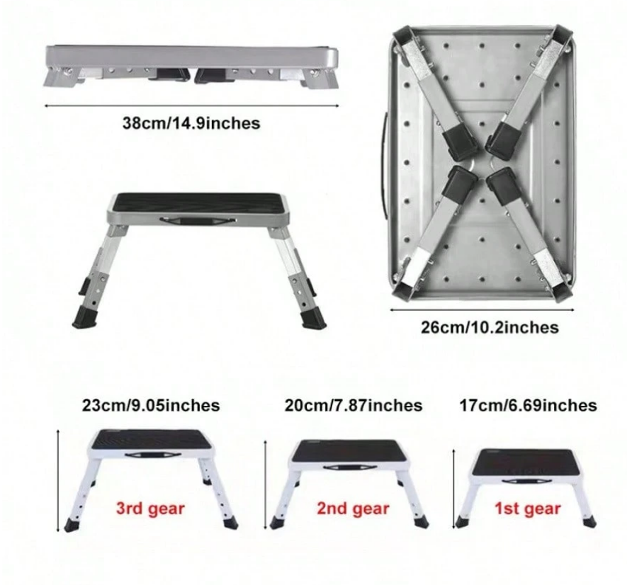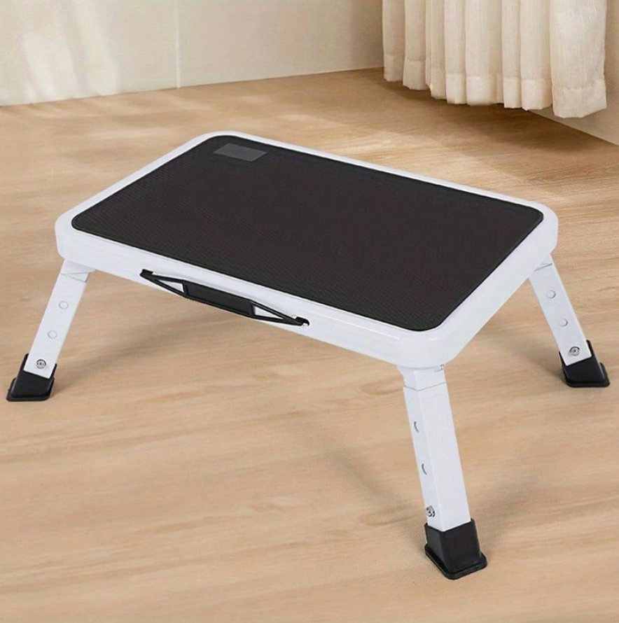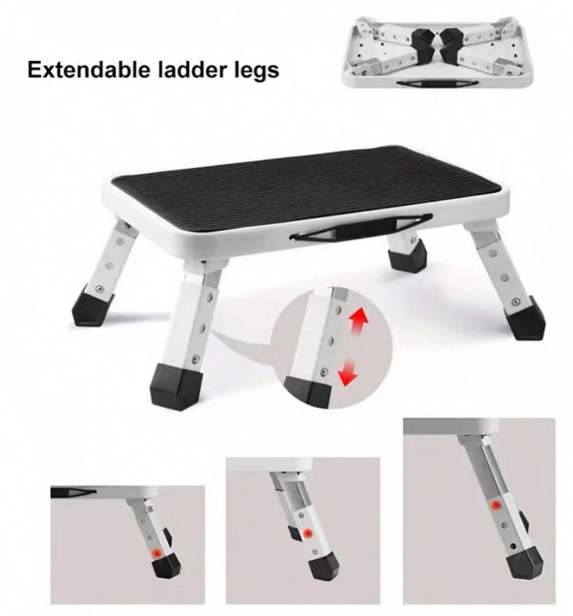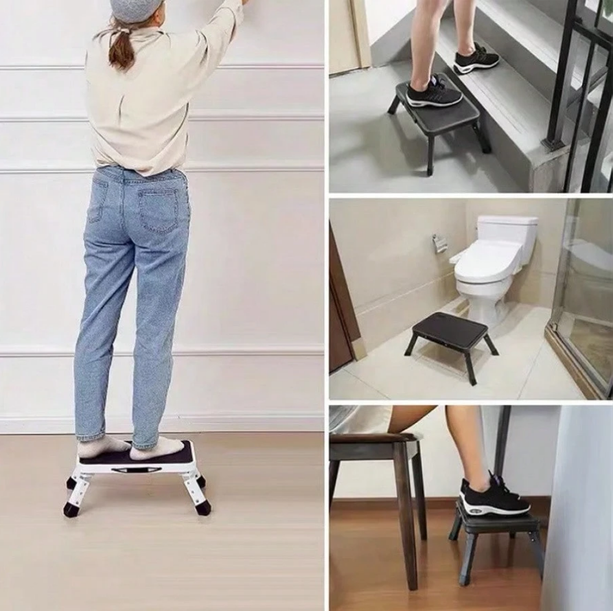 Der ideale Begleiter für zu Hause, im Badezimmer, in der Küche oder im Büro: unser **tragbarer faltbarer Metalltritthocker** vereint Langlebigkeit, Komfort und platzsparende Design. Mit einer **maximalen Tragkraft von 150 kg (330 lbs)** ist er stabil genug für den täglichen Gebrauch und gleichzeitig leicht und kompakt für unterwegs.